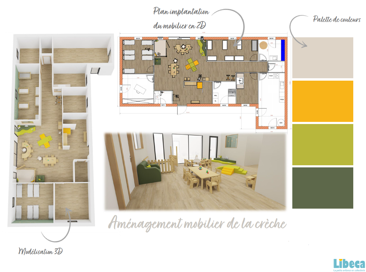 Enfin, la discrétion visuelle permet de préserver l’harmonie de l’espace tout en offrant au personnel un coin de travail identifié. Les couleurs douces et les formes épurées s’intègrent naturellement dans l’environnement coloré de la crèche.