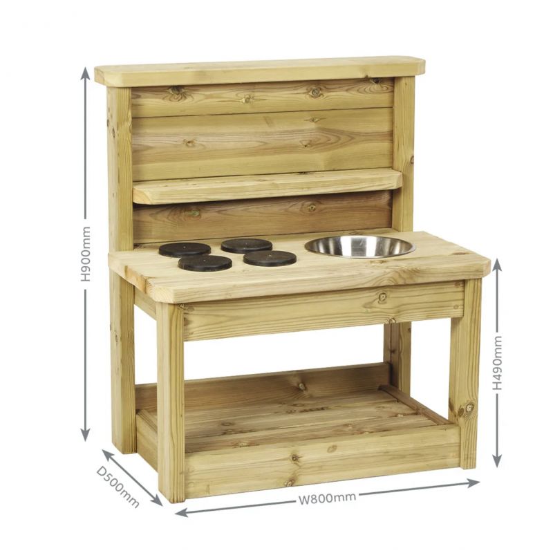 Petite cuisine d'extérieur pour les 3 ans et +. Équipée d'un bol amovible pour mélanger/explorer, de 4 plaques de cuisson, d'une étagère de rangement supérieure et inférieure. Comprend des fentes de rangement pratiques pour ranger les ustensiles.