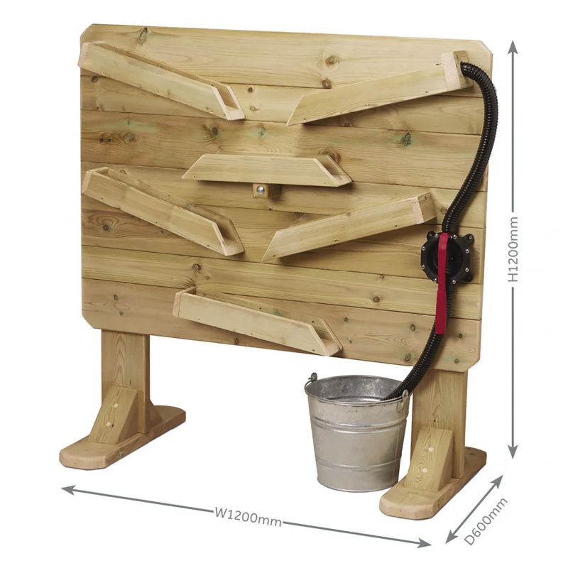 Mur d'eau autoportant pour les 3 ans et +. La conception autonome et robuste comprend une pompe à eau, un bac et 6 goulottes d'eau en bois. La pompe transporte l'eau vers la goulotte supérieure et de là, elle s'écoule le long du mur et s'accumule dans le bac situé en dessous - prête à recommencer le cycle.
