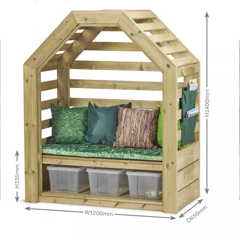 Coin lecture pour les 3 ans et +. Le coin lecture est doté d'un coussin de siège double face facile à nettoyer, sur toute la longueur, avec un motif d'herbe imprimé d'un côté et un motif d'écorce imprimé de l'autre. Sont également inclus quatre coussins coordonnés faciles à nettoyer (vert foncé, vert clair, marron et imprimé herbe) avec poignées de transport et trois bacs de rangement pratiques avec couvercles qui s'insèrent parfaitement sous la zone assise.