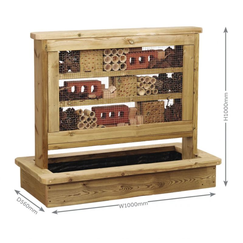 Hôtel à insecte avec jardinière pour les 3 ans et +. Contient trois niveaux avec une variété de matériaux dans chacun, tous conçus pour encourager les insectes à créer leur nouvel habitat. Herbe non incluse. Comprend une membrane perméable à l'eau pour contenir le sol.