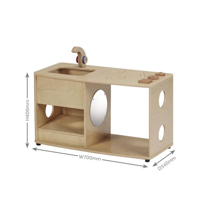 Cuisine d'activités pour les tout-petits. Cuisine compacte tout-en-un, conçue pour les enfants de 6 mois et plus. Hauteur du plan de travail de 400 mm, parfaite pour les bébés et les tout-petits. Comprend une plaque de cuisson, un évier, un miroir sensoriel, une zone de rampement.