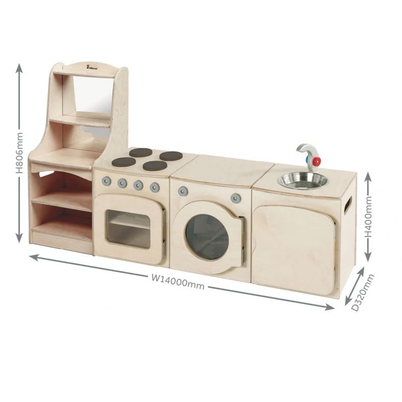 Ensemble de cuisine de 4 éléments - Pour les tout-Petits (H400 mm). Comprend : cuisinière, évier, lave-linge et commode de rangement. Hauteur du plan de travail de 440 mm.
